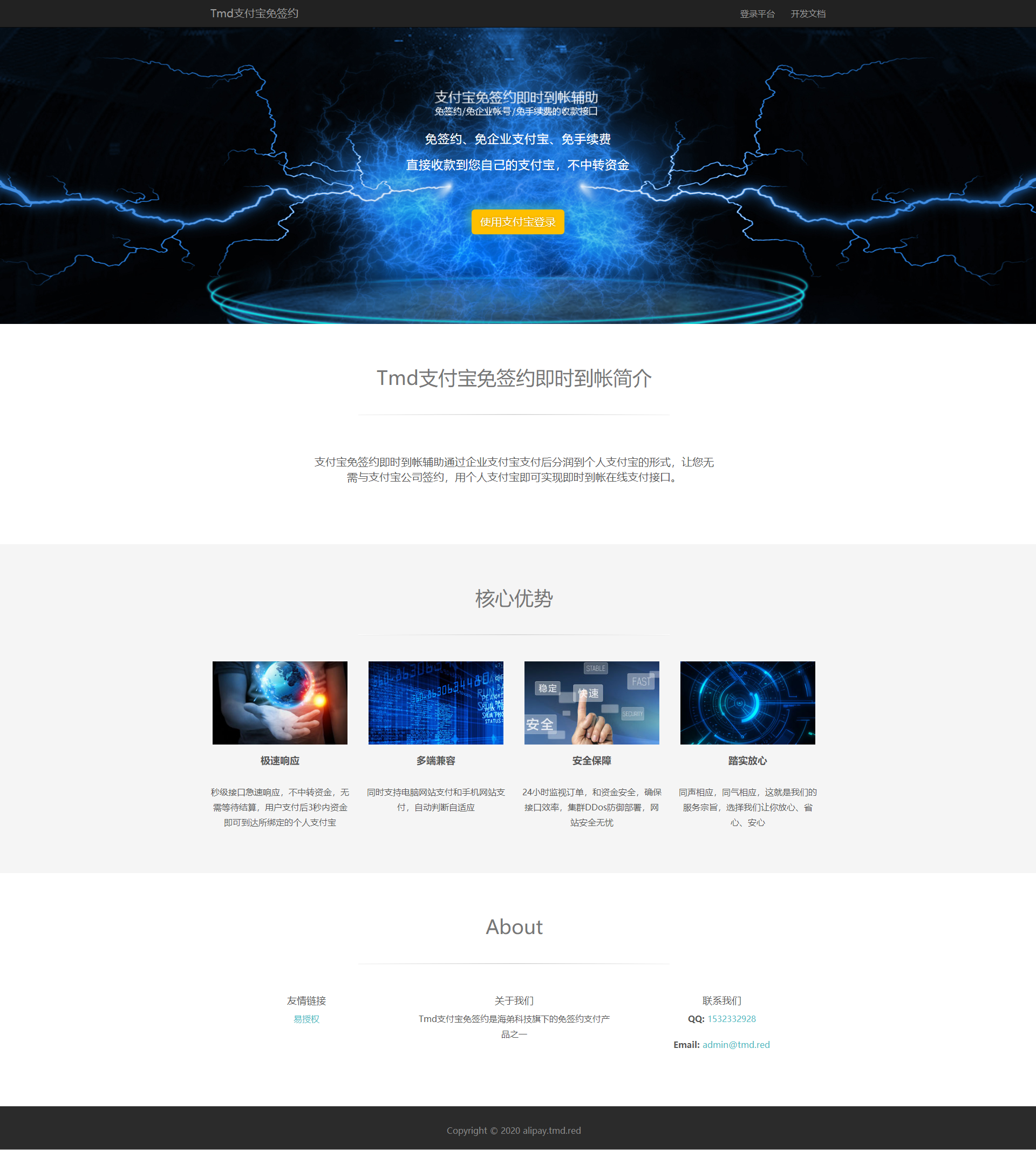支付宝免签嬳即时到帐辅助通过企业支付宝支付后分润到个人支付宝的形式,让您无需与支付宝公司签嬳,用个人支付宝即可实现即时到帐在线支付接口。