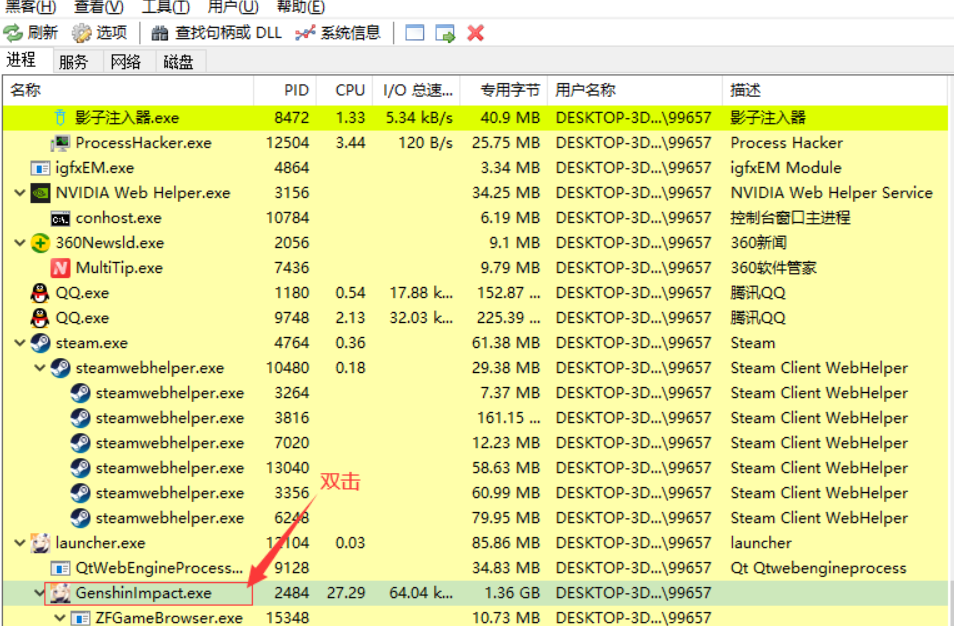 2.找到游戏进程,并双击
